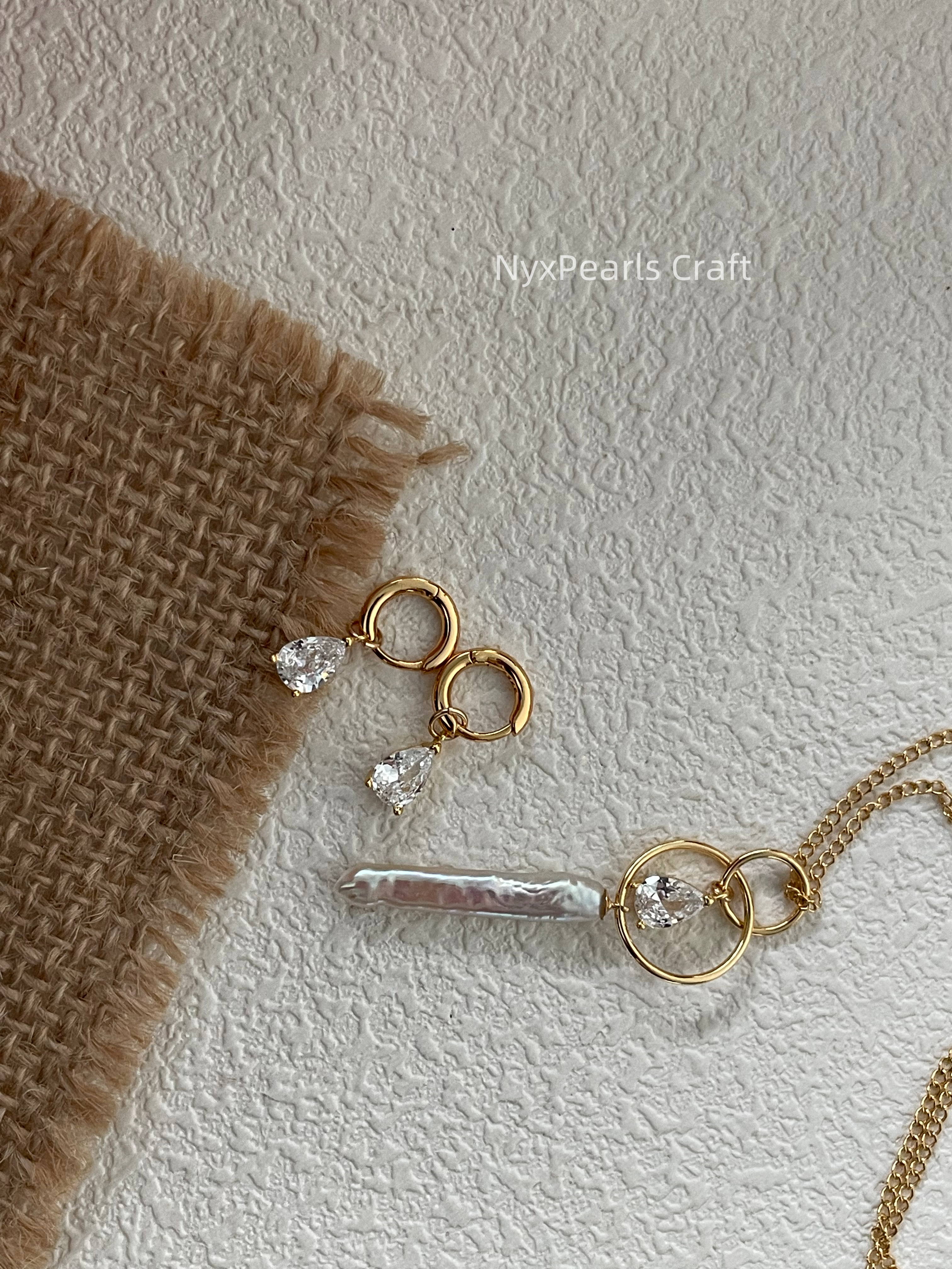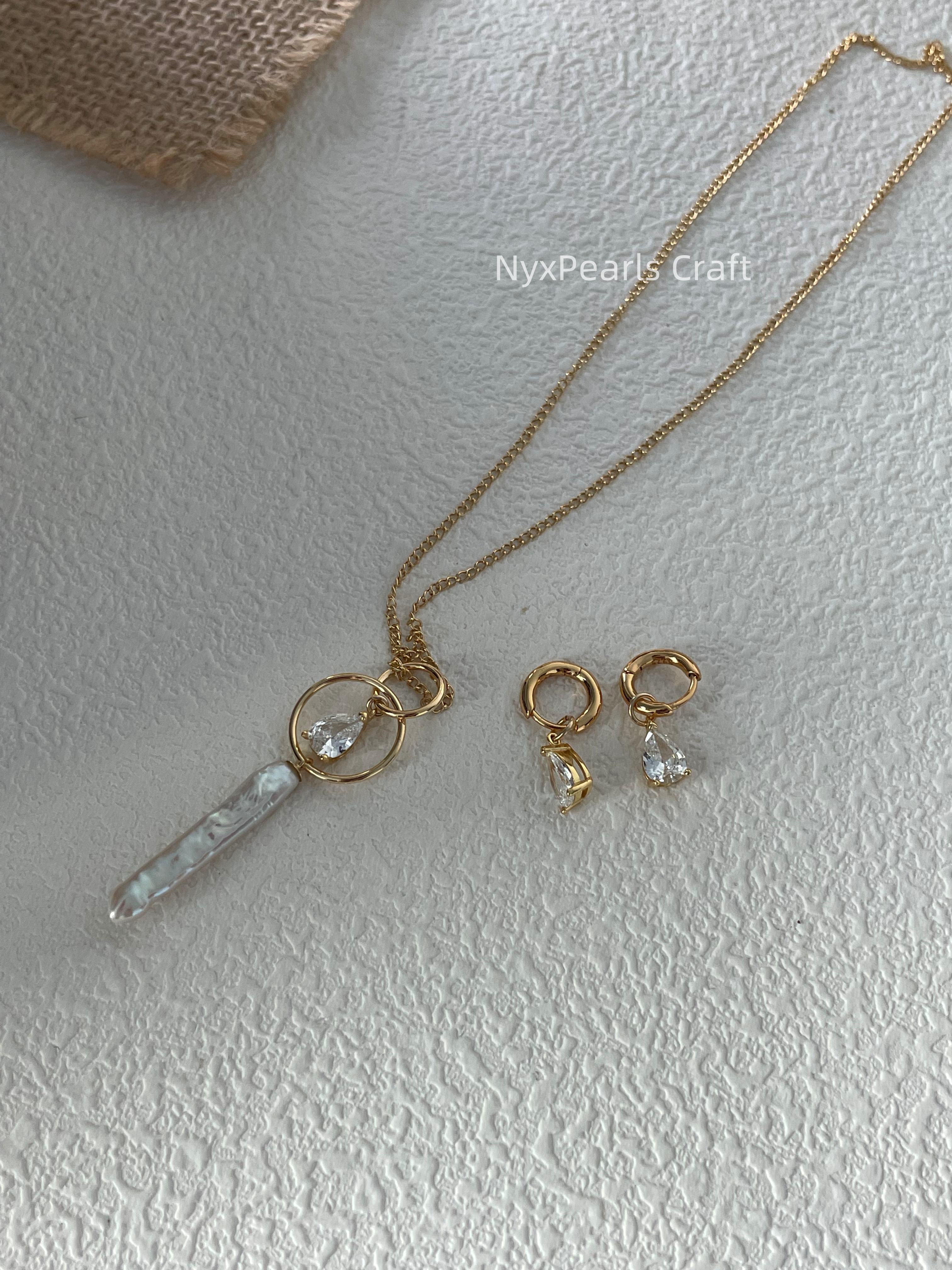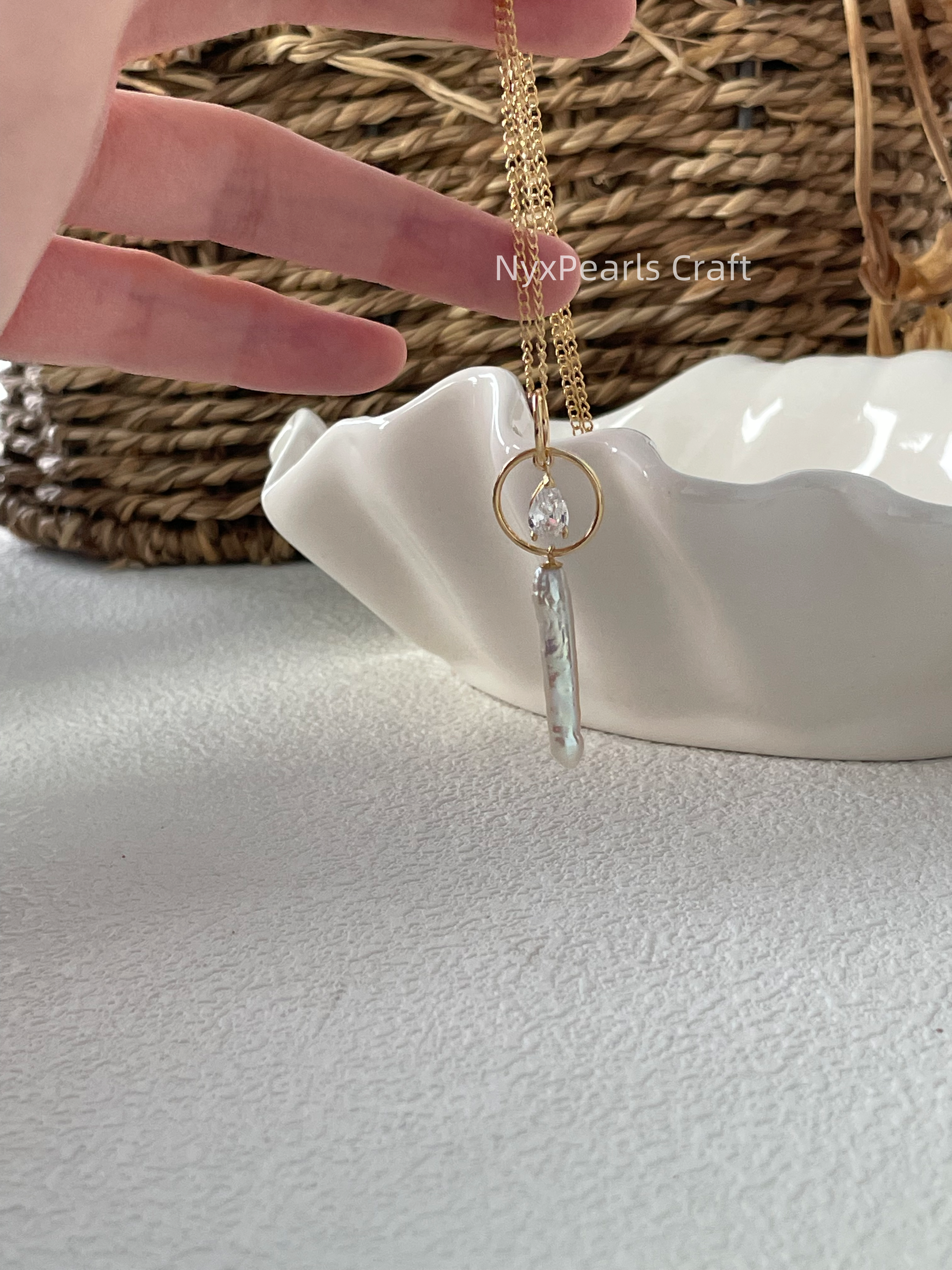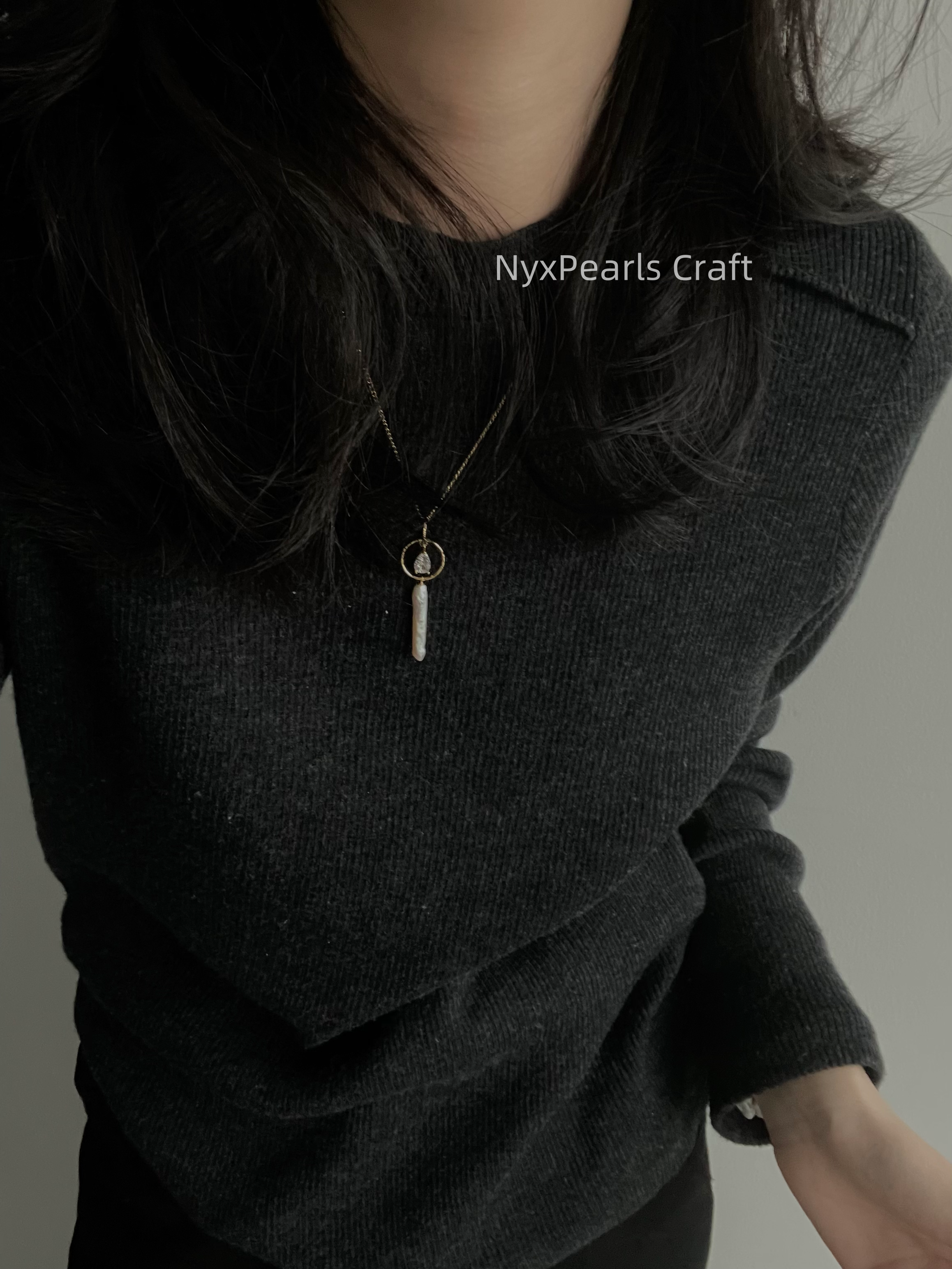 This statement necklace features a striking baroque stick pearl, suspended from a beautifully designed double-ring accent. The combination of U.S. 14K gold-filled chain and 18K gold-plated silver details adds a refined yet modern touch. A distinctive piece for effortless elegance.