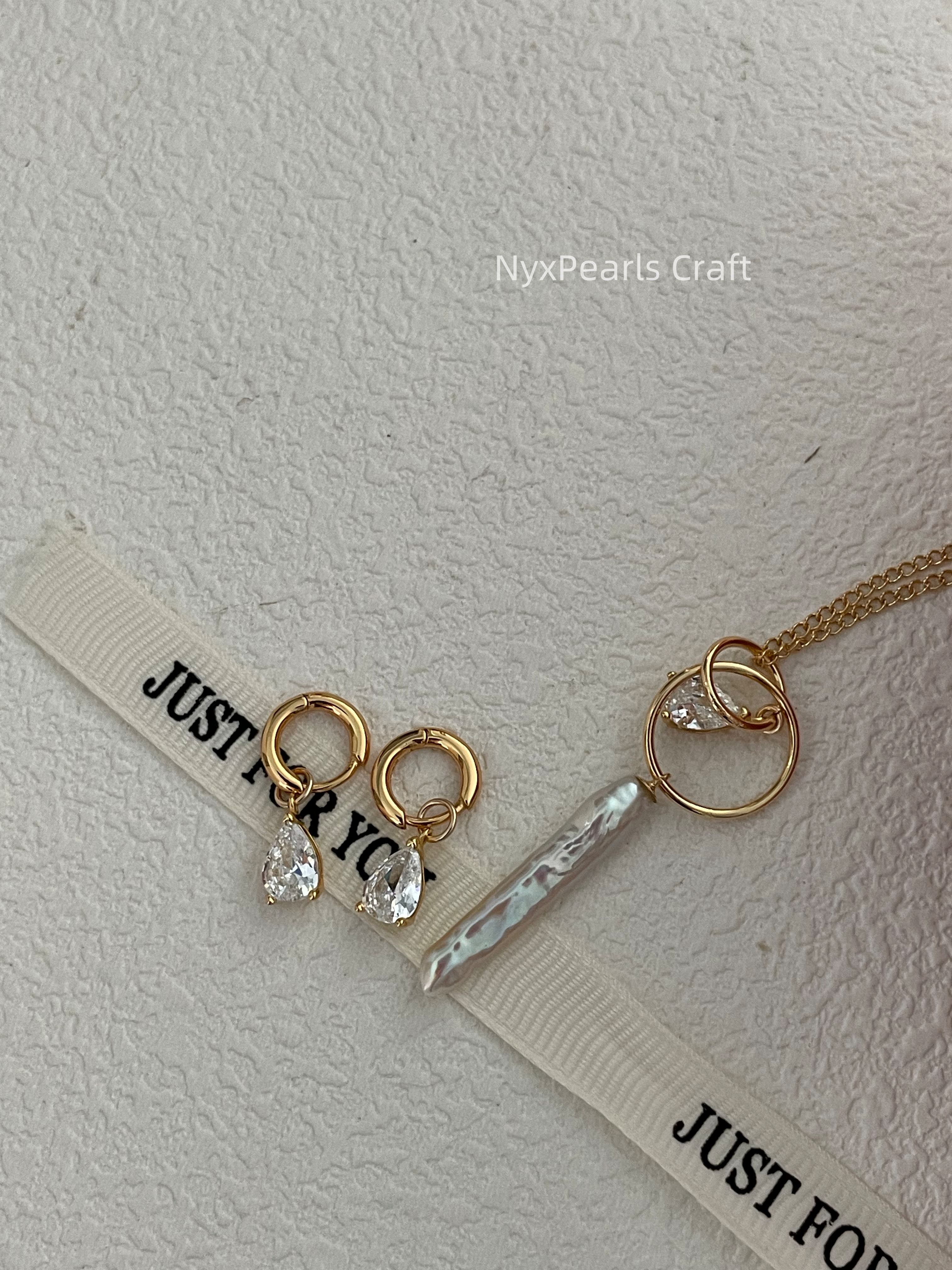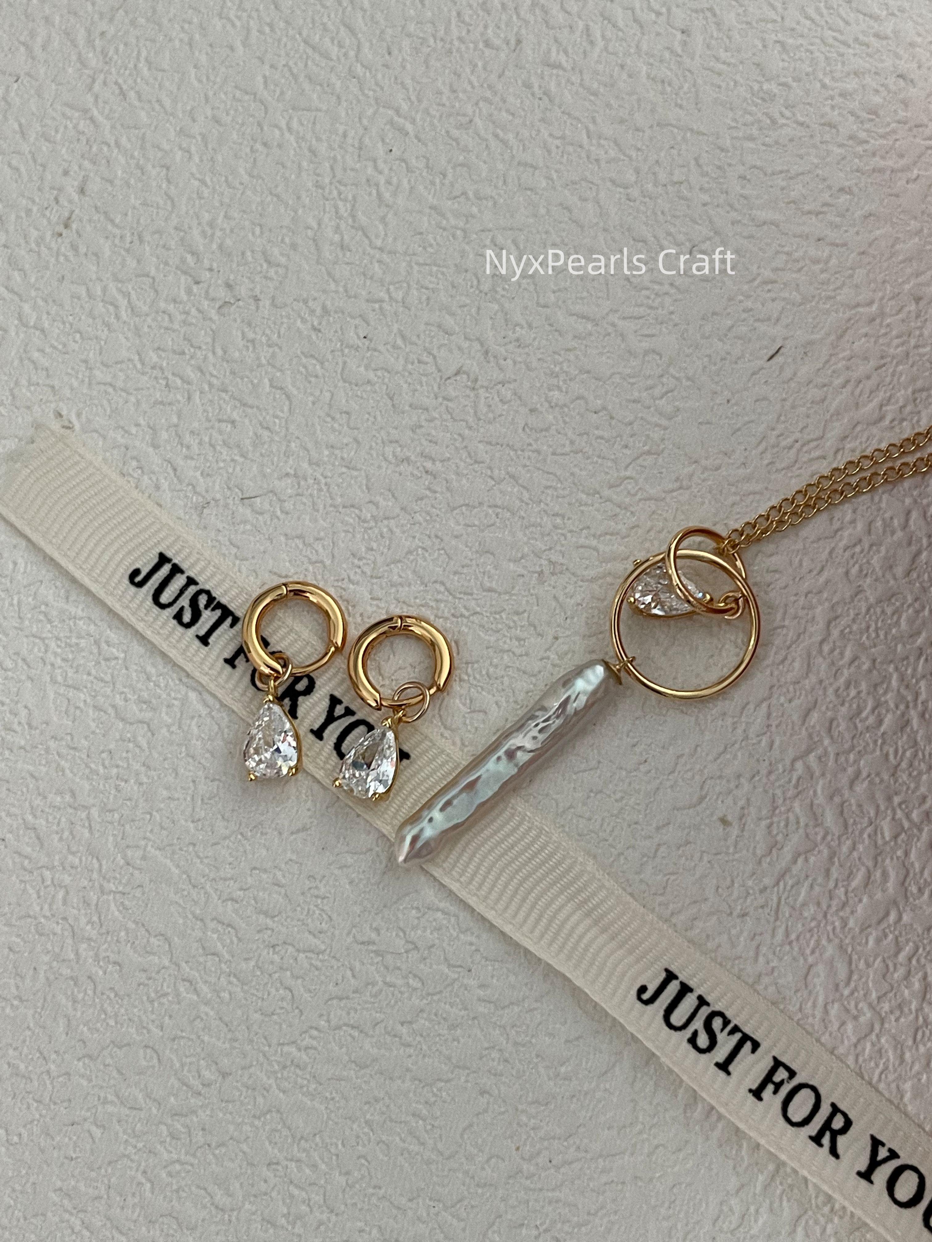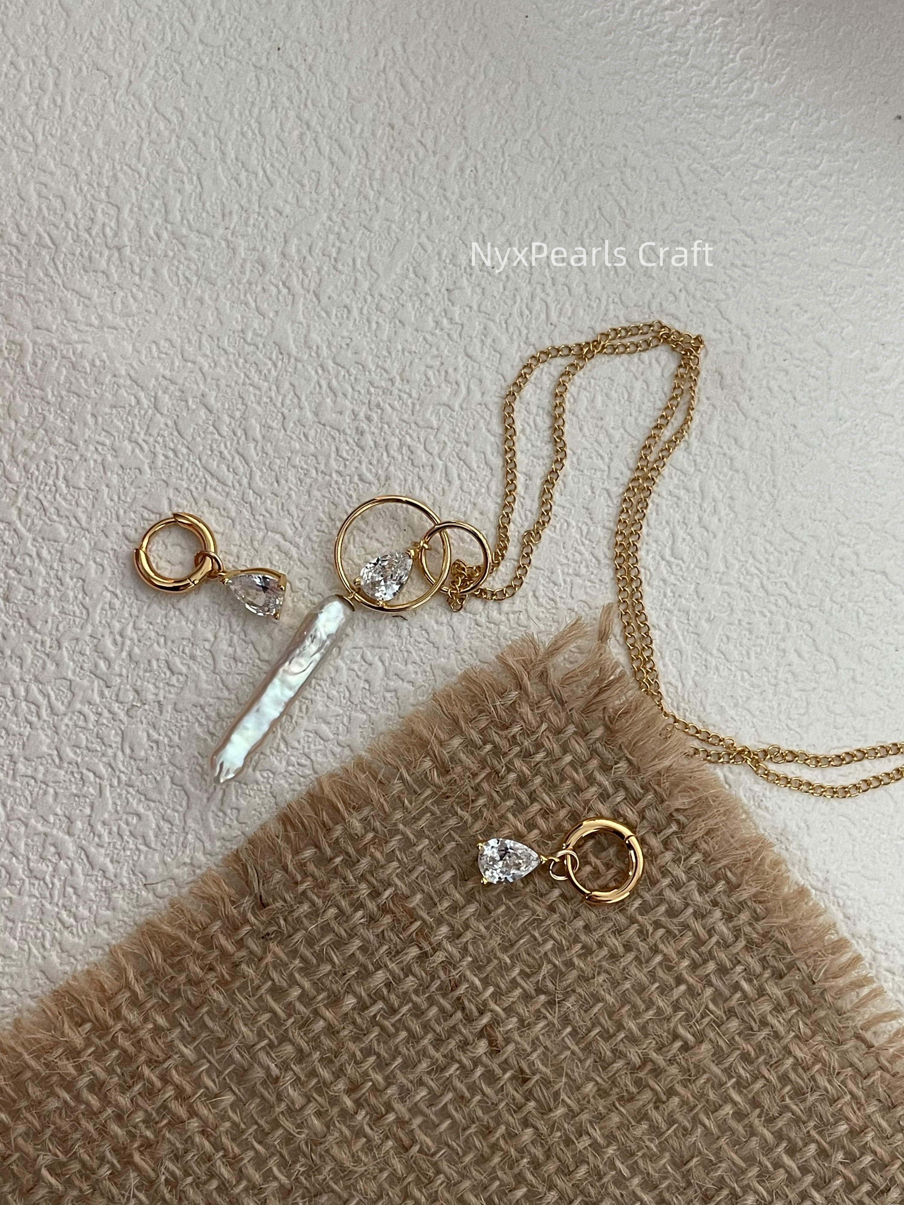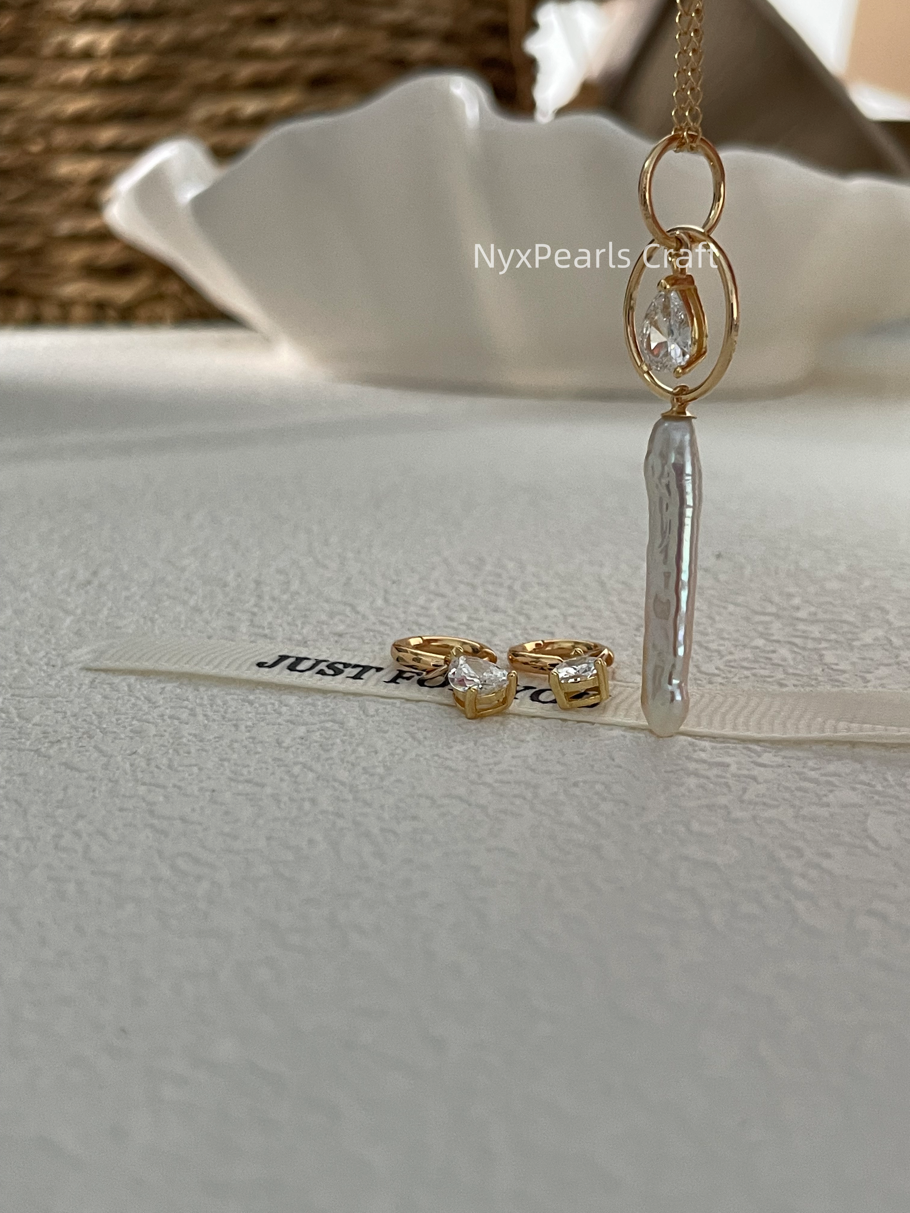 This statement necklace features a striking baroque stick pearl, suspended from a beautifully designed double-ring accent. The combination of U.S. 14K gold-filled chain and 18K gold-plated silver details adds a refined yet modern touch. A distinctive piece for effortless elegance.
