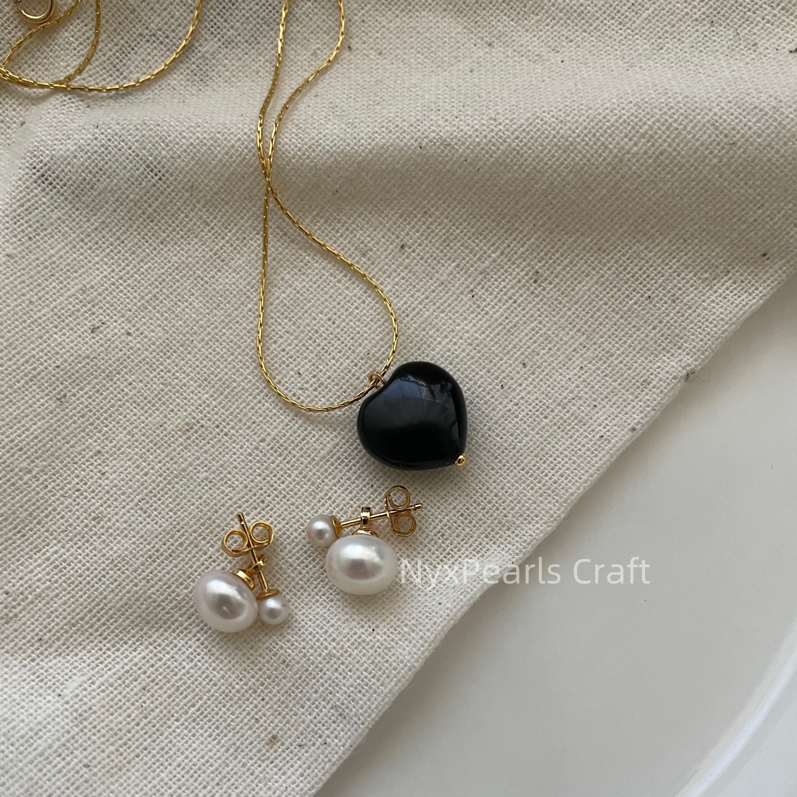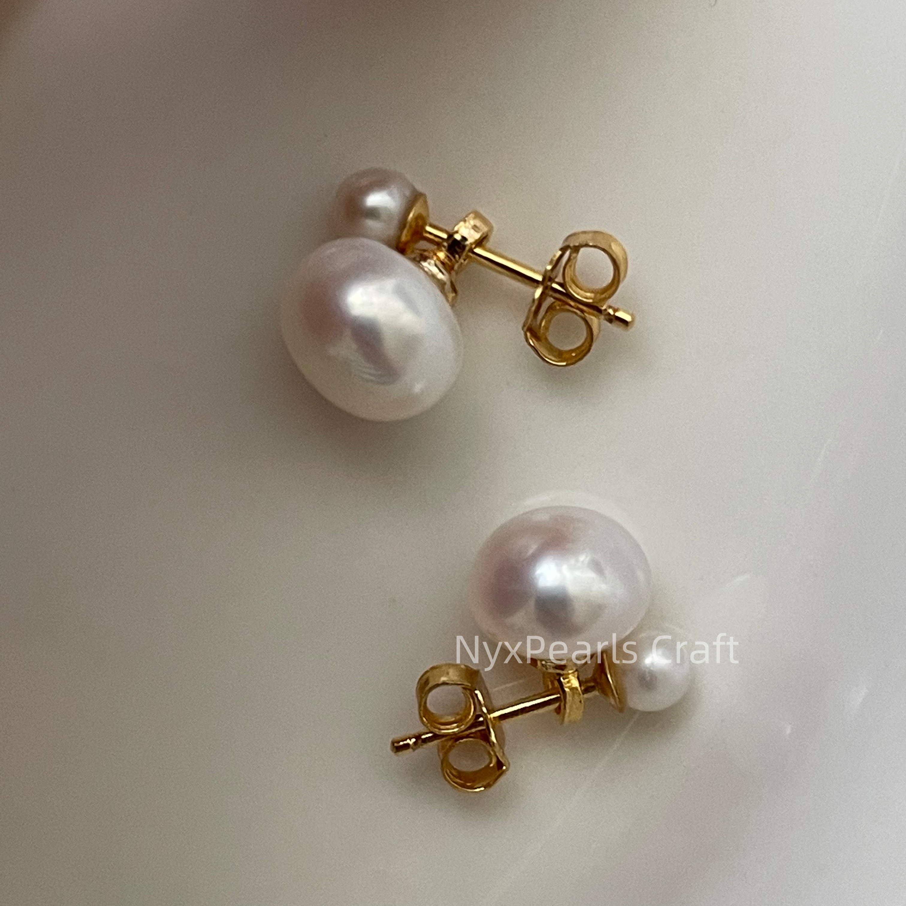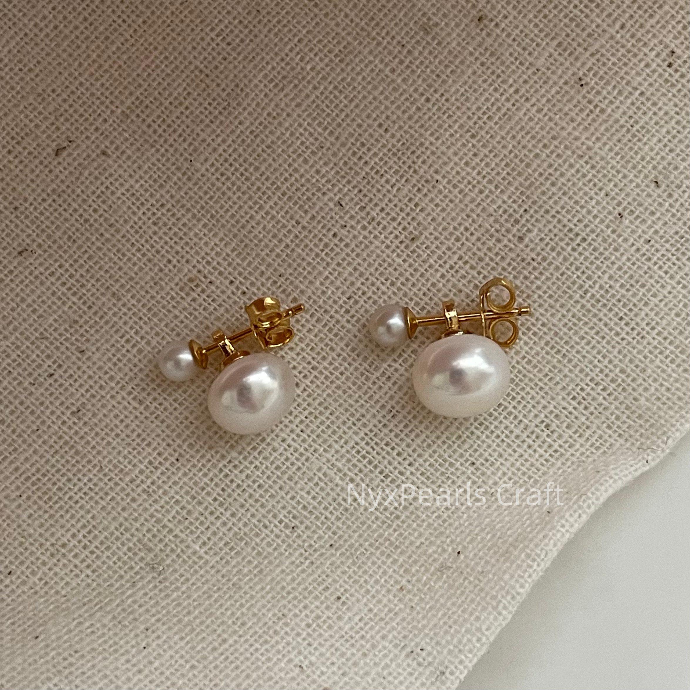 These stylish double pearl stud earrings feature a modern front-and-back design with a delicate 2-3mm pearl in front and a bold 7-8mm button pearl at the back. Crafted with premium 14K gold-filled components in warm gold tones, they blend contemporary flair with the timeless beauty of natural freshwater pearls. The lustrous cap detail on the larger pearl adds a refined golden touch, making them stand out from classic pearl earrings.