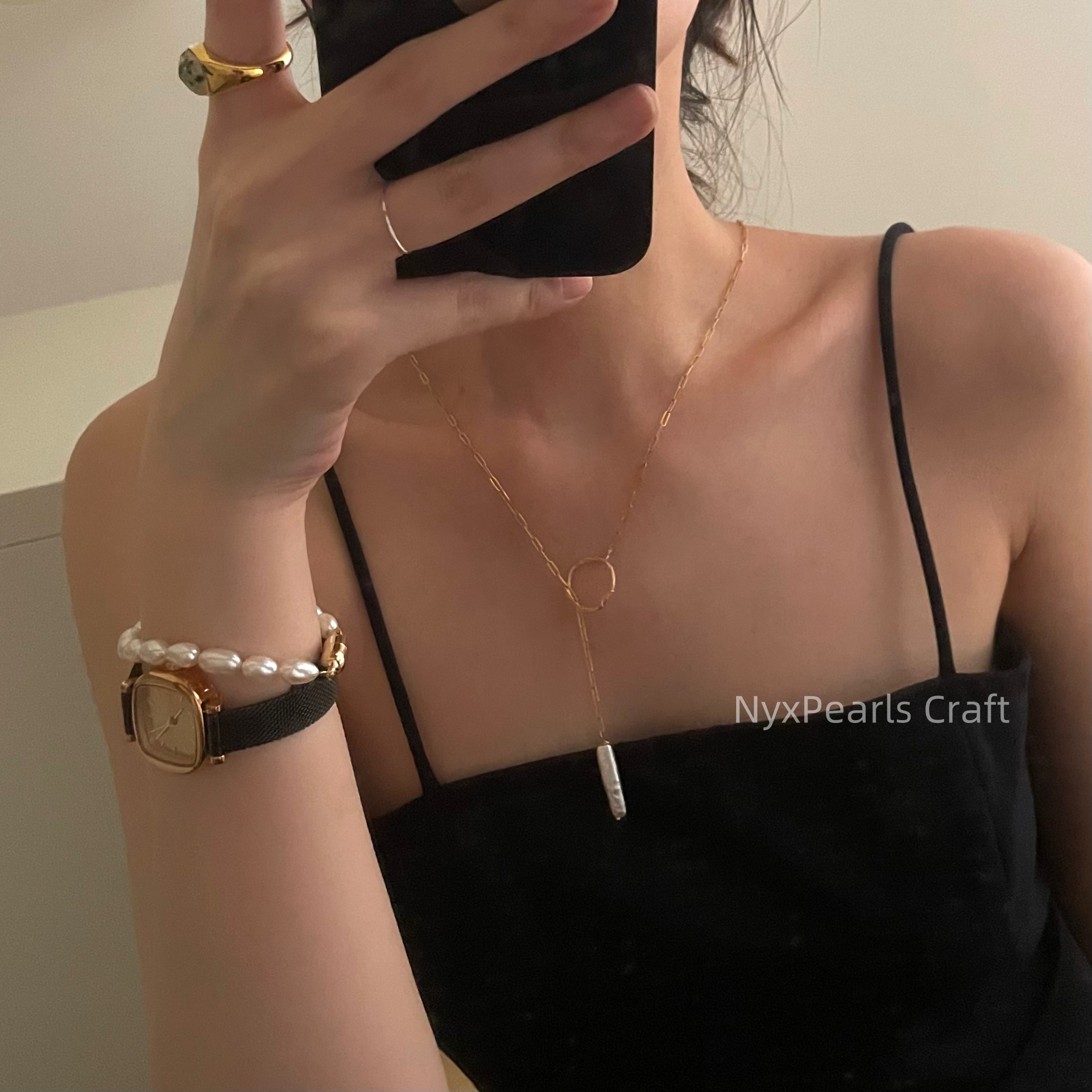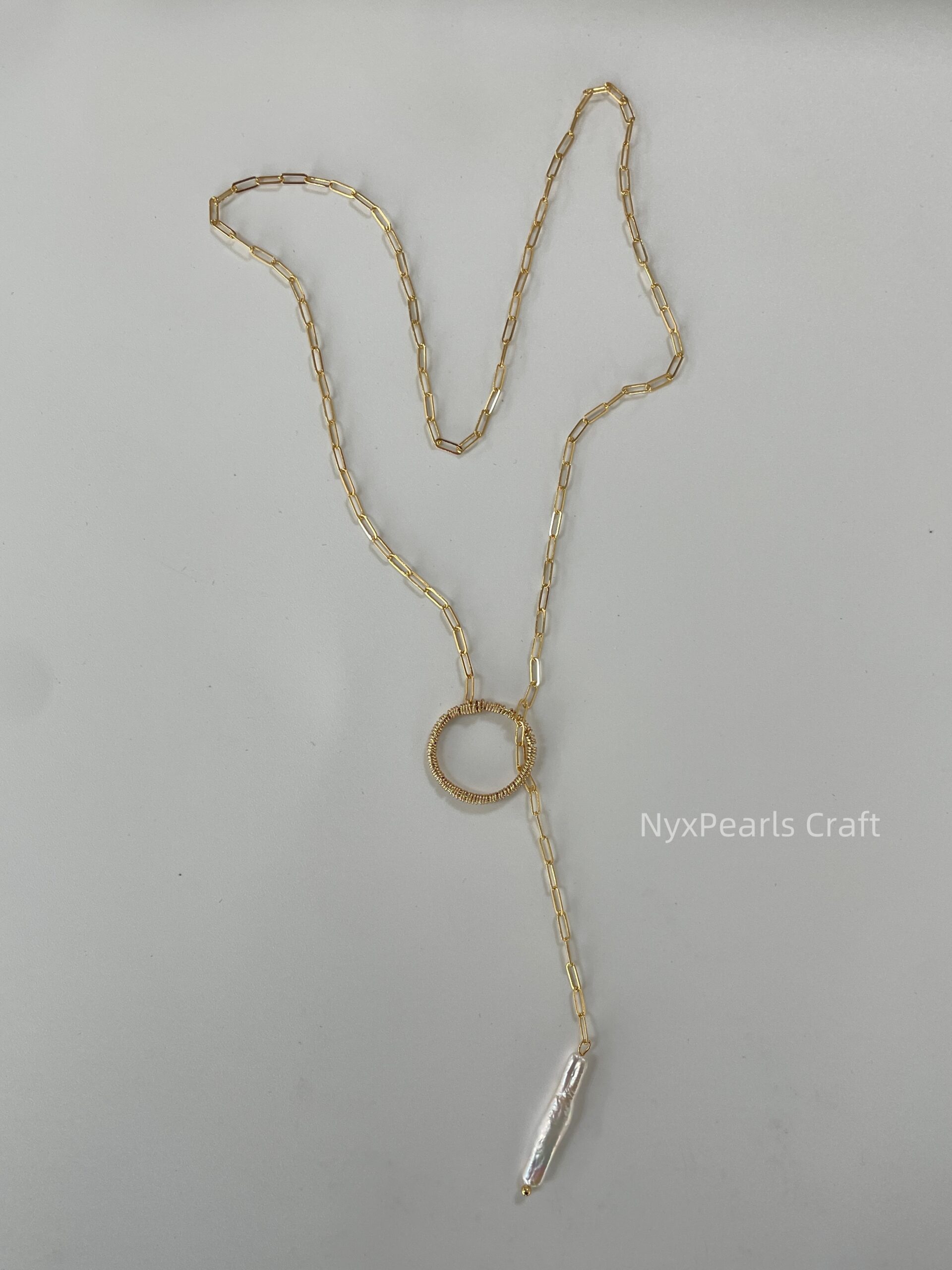 Elevate your jewelry collection with the 034 Long Baroque Circle Pearl Necklace, a piece that seamlessly blends natural elegance with contemporary design. This necklace features elongated baroque pearls, each showcasing unique shapes and iridescent luster, highlighting the organic beauty of nature. The 50cm chain provides a comfortable fit, gracefully adorning your neckline. Crafted with premium 14K gold-filled material from the USA, this necklace ensures both durability and a luxurious finish.